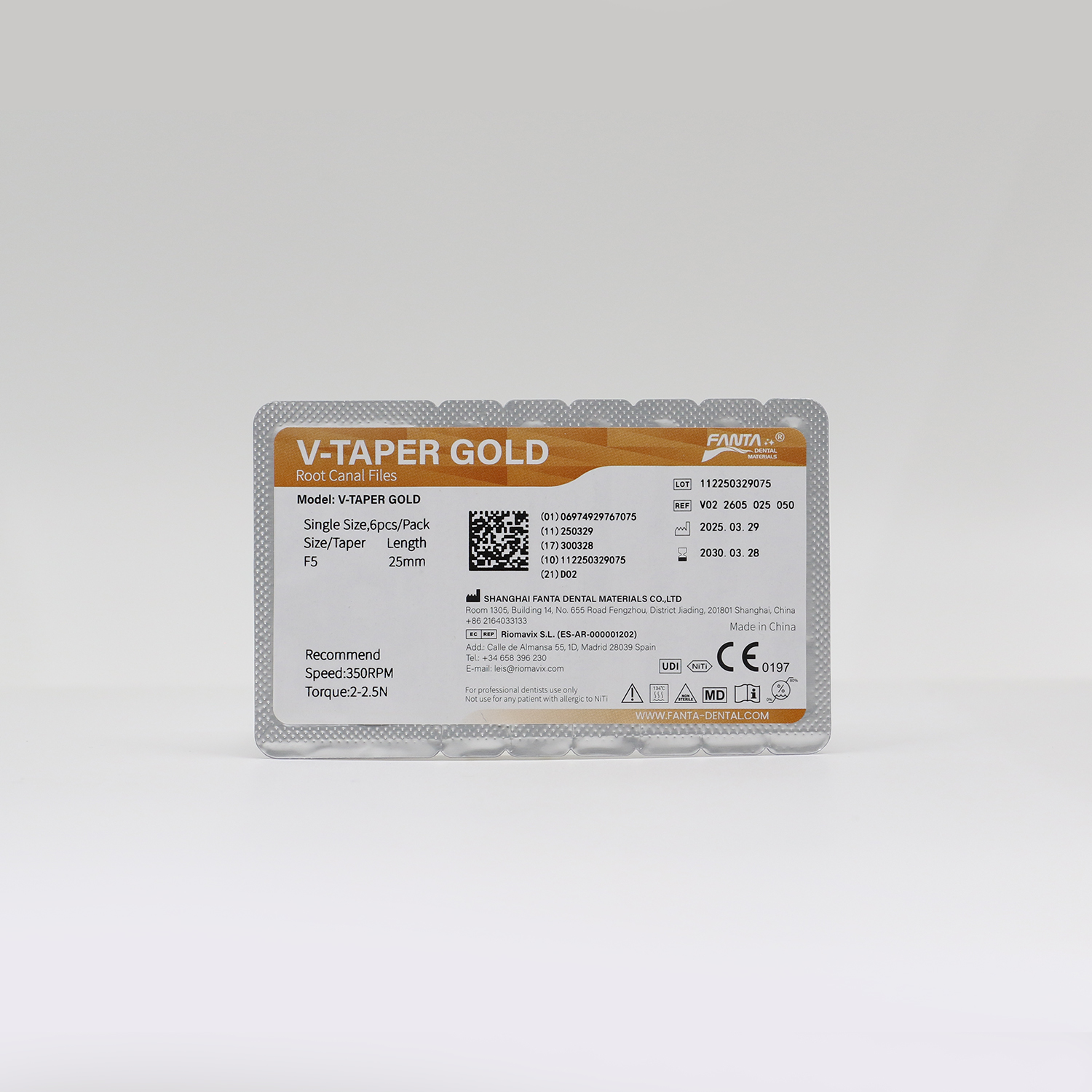 Ürün Kodu: FANTA F5Fanta Dental V-TAPER GOLD, F5, 25mm (#50 çap, %05 konik); yapısıyla kanal anatomisini şekillendirmede beşinci kullanılacak eğe olarak tasarlanmıştır.